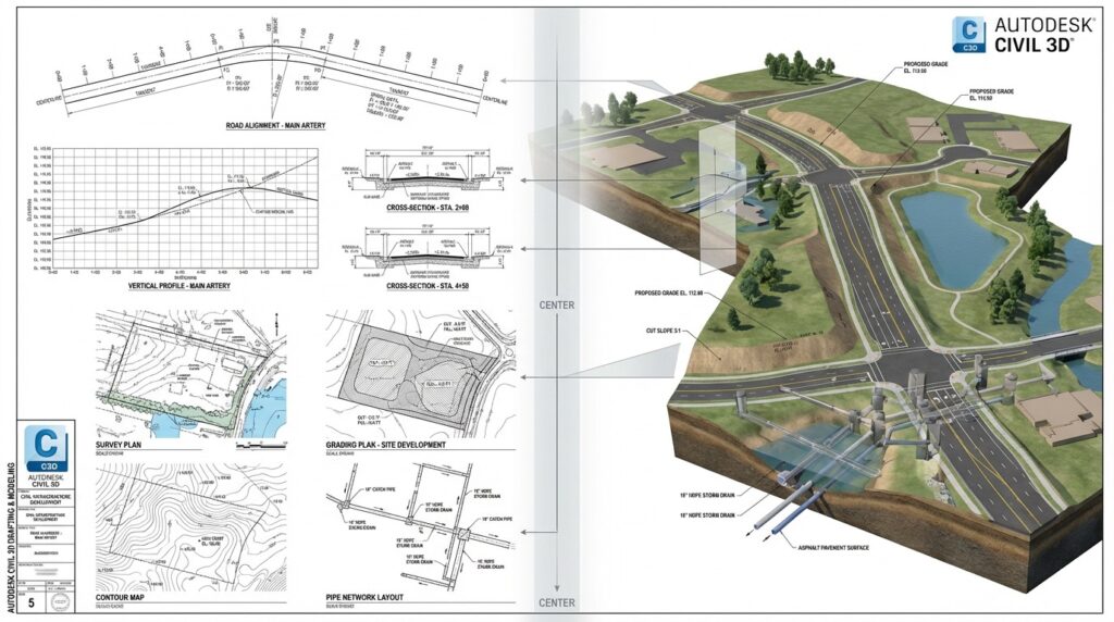 This course focuses on AutoCAD Civil 3D, designed specifically for civil engineers. Participants will learn to create intelligent 3D models for civil engineering projects, including roads, land development, and infrastructure. The course covers grading, drainage design, and collaboration tools for streamlined project workflows.